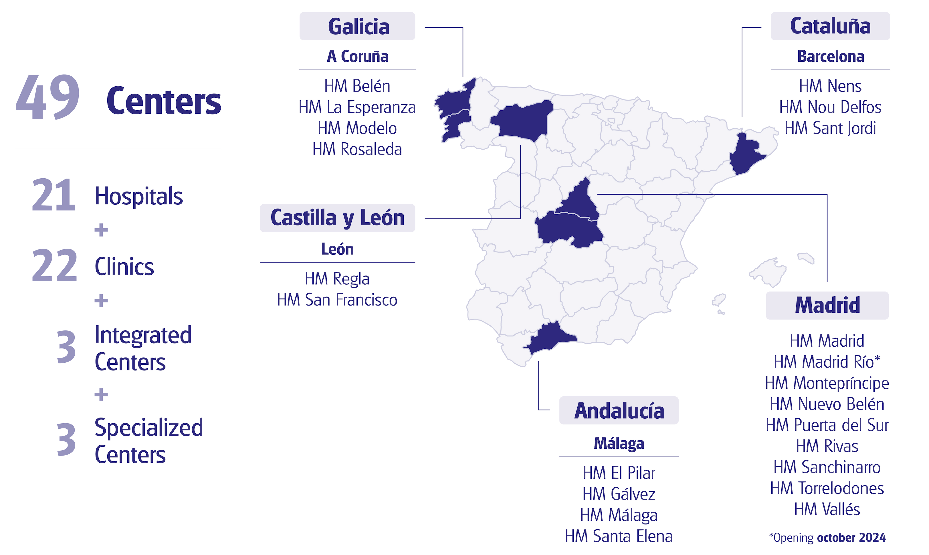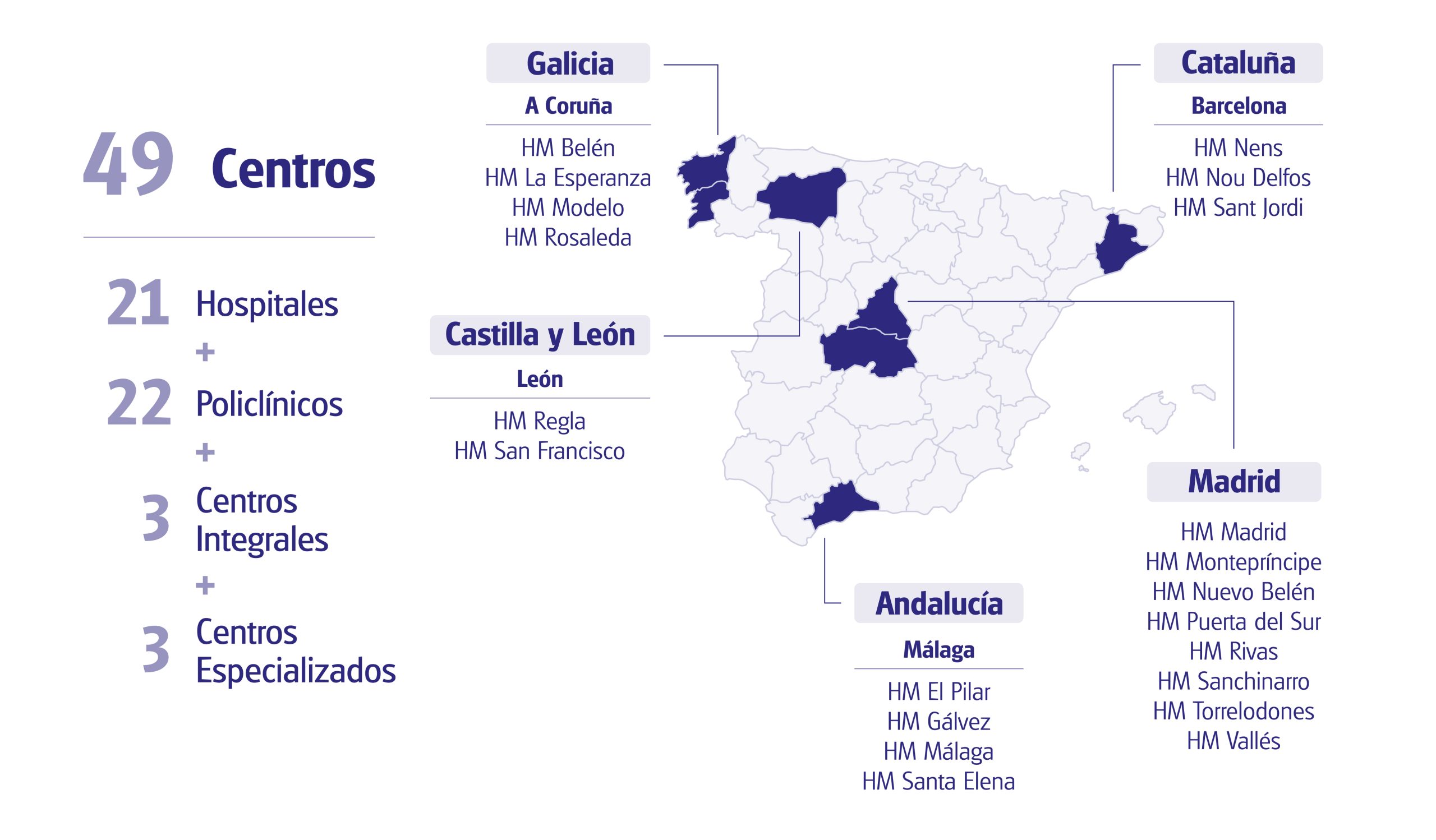 Founded in 1989, HM Hospitales has become Spain’s leading hospital group, boasting over 49 clinics and 5,000 employees, supported by 4,000 associated doctors. Operating across Galicia, León, Costa del Sol, Madrid and Barcelona, it includes specialized centers for Neurosciences, Cardiology and Oncology, plus centers for Fertility, Vision, and Dental care, all led by top medical experts and equipped with the latest technology.